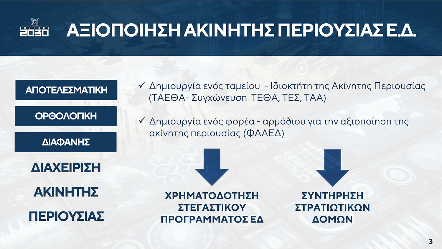 Για την αξιοποίηση της ακίνητης περιουσίας των Ενόπλων Δυνάμεων, ο κ. Δένδιας επισήμανε ότι «έχει κατατεθεί νομοσχέδιο για την ενοποίηση των τριών Ταμείων σε ένα φορέα αρμόδιο για την αξιοποίηση» ενώ υπογράμμισε: «Φιλοδοξία μα είναι να αξιοποιηθούν τα έσοδα για τη χρηματοδότηση του στεγαστικού προγράμματος των Ενόπλων Δυνάμεων και τη συντήρηση των υποδομών».