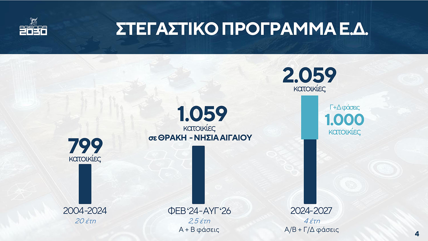 Ειδικότερα, για το στεγαστικό ανέφερε ότι τα τελευταία 20 χρόνια είχαν κατασκευαστεί συνολικά μόνο 799 κατοικίες ενώ από την έναρξη του προγράμματος και μέχρι τον Αύγουστο του 2026 θα έχουν κατασκευαστεί 1059 νέες κατοικίες. Στόχος, είπε, το 2027 να φτάσουμε τις 2059 κατοικίες.