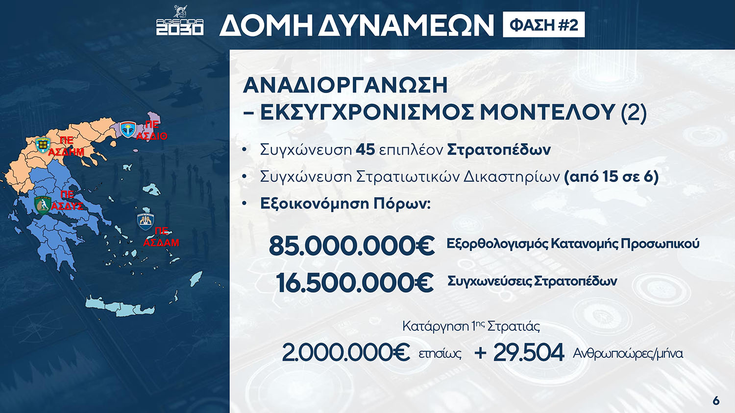 Μόνο από την κατάργηση του επιπέδου της Στρατιάς θα απελευθερωθούν εκατοντάδες ικανότατοι Αξιωματικοί, των οποίων οι δυνατότητες θα μπορούν να αξιοποιηθούν με πολύ καλύτερο τρόπο από εδώ και πέρα.Μόνον η κατάργηση της Στρατιάς μάς δίνει 30.000 ώρες, ανθρωποώρες εξοικονόμηση τον μήνα. Για την ακρίβεια 29.504».
