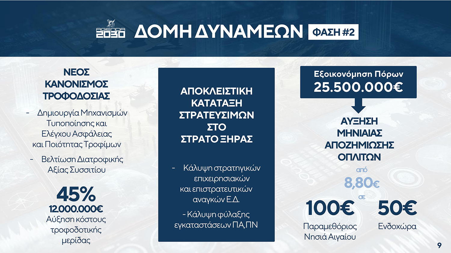 Θα έχουμε από όλα αυτά μια συνολική εξοικονόμηση πόρων 85 εκατομμυρίων τον χρόνο και μια επιπλέον εξοικονόμηση 16,5 εκατ. από τις συγχωνεύσεις των στρατοπέδων.