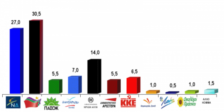 Η έρευνα αποτυπώνει την στιγμή που γίνεται και εκτός από την πρωτιά στον ΣΥΡΙΖΑ, δίνει 3ο κόμμα την Χρυσή Αυγή με 14% και τέταρτο κόμμα οι Ανεξάρτητοι Έλληνες με 7%. Το ΚΚΕ είναι πέμπτο με 6,5% και ΠΑΣΟΚ και ΔΗΜΑΡ από 5,5%.