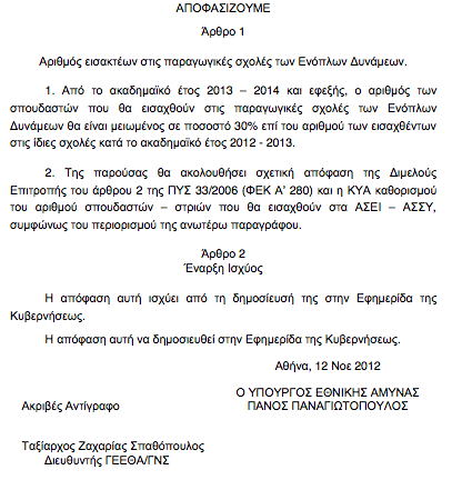 Δημοσιεύσθηκε η απόφαση για την μείωση των εισακτέων κατά 30%, μείωση που περιλαμβανόταν επί της ουσίας στις απαιτήσεις της τρόϊκας. Δείτε την απόφαση, που ενδιαφέρει τους νέους που έχουν σκοπό να δοκιμάσουν την εισαγωγή τους σε μία απ΄ αυτές.