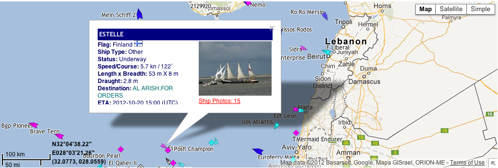 Η τελευταία θέση στην οποία το εντοπίστηκε ήταν δίπλα σε εξέδρα έρευνας και άντλησης πετρελαίου ,αιγυπτιακής εταιρείας, ανοιχτά από τις ακτές της Αιγύπτου και σε απόσταση περίπου 150 μιλίων από τη Γάζα, που είναι και ο προορισμός του.