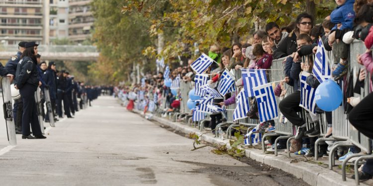 Άλλη μία “σιδερόφρακτη” παρέλαση. Με τις γαλανόλευκες σημαίες πίσω από κάγκελα. Και το πλήθος να είναι υπό ασφυκτικό αστυνομικό κλοίο.