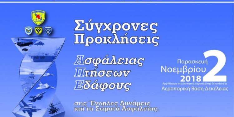 Την Παρασκευή 2 Νοεμβρίου 2018 πραγματοποιήθηκε στην Αεροπορική Βάση Δεκέλειας, η 1η Διακλαδική Ημερίδα Ασφάλειας Πτήσεων και Εδάφους (ΑΠΕ), με θέμα “Σύγχρονες Προκλήσεις ΑΠΕ στις Ένοπλες Δυνάμεις και στα Σώματα Ασφαλείας”, η οποία διοργανώθηκε από το ΓΕΕΘΑ.
