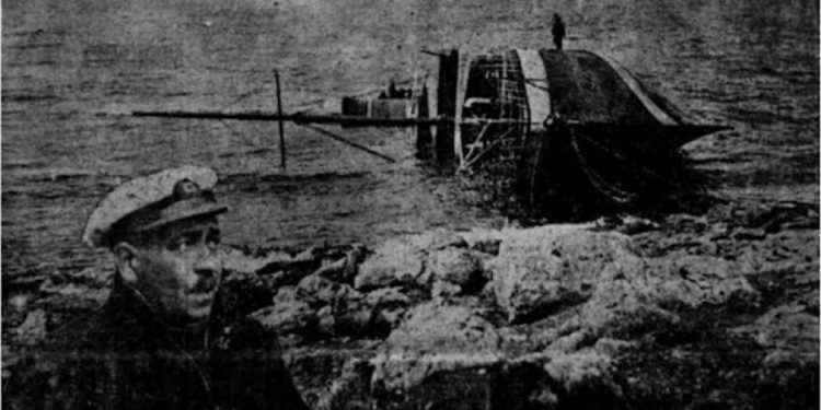 Οι τρεις αξιωματικοί γέφυρας του «Πόπη» πάνω στο ξερονήσι που έριξαν το καράβι, αναμένουν να τους πάρουν για τον Πειραιά. Πίσω τους στοιβαγμένα κεφάλια από τυριά που φρόντισαν οι άνδρες του πληρώματος να βγάλουν την ίδια στιγμή που οι επιβάτες πνίγονταν!