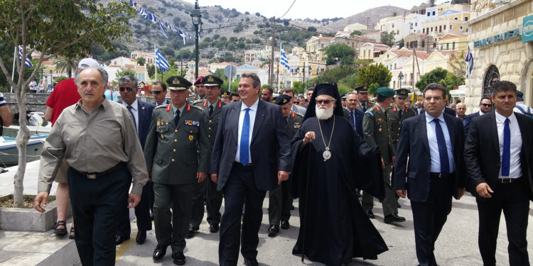 Ο Υπουργός Εθνικής Άμυνας Πάνος Καμμένος, συνοδευόμενος από τον Αρχηγό ΓΕΕΘΑ Στρατηγό Μιχαήλ Κωσταράκο και τον Αρχηγό ΓΕΣ Αντιστράτηγο Βασίλειο Τελλίδη, παρέστη στη Σύμη στις εκδηλώσεις για την Επέτειο της 8ης Μαΐου 1945.