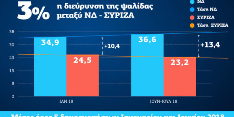 Οι πέντε τελευταίες δημοσκοπήσεις δίνουν διαφορά 13,4% ανάμεσα στη Νέα Δημοκρατία και τον ΣΥΡΙΖΑ σύμφωνα με τα στοιχεία που επικαλείται και έδωσε στη δημοσιότητα το Σάββατο (07.07.2018).