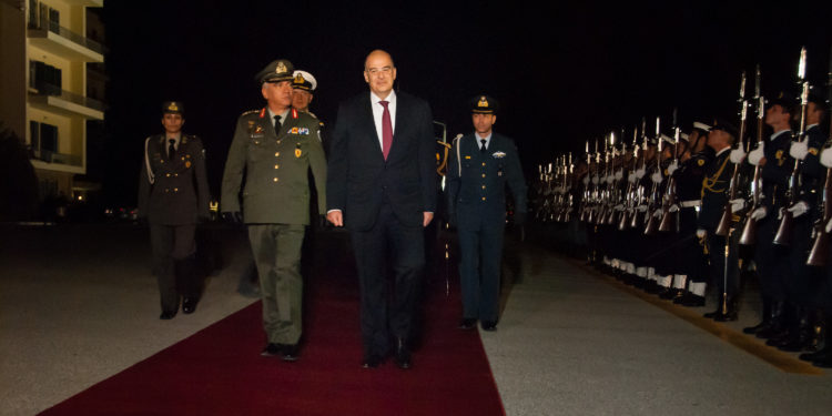 Ο Νίκος Δένδιας όπως και όλοι οι προκάτοχοί του -από τον Βαρβιτσιώτη και μετά- έδειξε να νοιώθει το τρακ και το δέος μόλις πατούν το κόκκινο χαλί για να επιθεωρήσουν για πρώτη φορά το άγημα,με την μπάντα να παιανίζει.