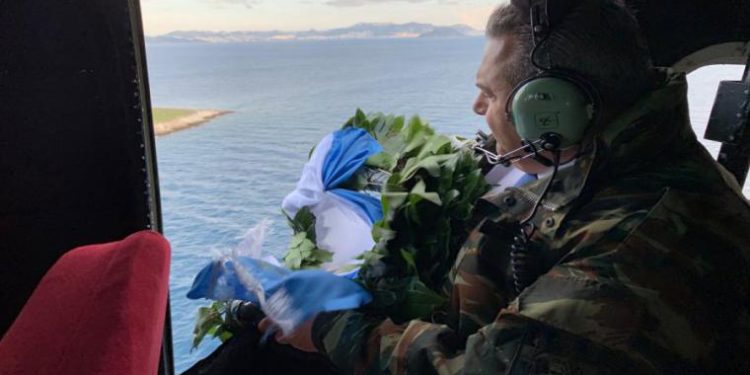 Η στιγμή που ο ΥΕΘΑ @PanosKammenos πραγματοποιεί ρίψη στεφάνου στο θαλάσσιο χώρο των Ιμίων, στον τόπο θυσίας των τριών ηρώων Αξιωματικών του ΠΝ Χριστόδουλου Καραθανάση, Παναγιώτη Βλαχάκου και Έκτορα Γιαλοψού. ΑΘΑΝΑΤΟΙ! pic.twitter.com/Qg6uJ45yMY
