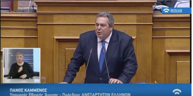 Τη διαφωνία του με τους κυβερνητικούς χειρισμούς στις διαπραγματεύσεις για την ονομασία των Σκοπίων, εξέφρασε χωρίς περιστροφές, ο υπουργός Εθνικής Άμυνας κ. Πάνος Καμμένος, κατά την ομιλία του στη μαραθώνια συζήτηση στη Βουλή για τη σύσταση προανακριτικής επιτροπής για την υπόθεση Novartis. «Βεβαίως και διαφωνώ με την κυβέρνηση για τους χειρισμούς, το έχω πει δημόσια, του ονόματος Μακεδονίας» ήταν η χαρακτηριστική αποστροφή του κ. Καμμένου, ο οποίος απαντώντας στις -από τα έδρανα- αιτιάσεις του προέδρου της Ένωσης Κεντρώων για τη στάση του στο ζήτημα, πρόσθεσε: «και θα κάνω τα πάντα για να σταματήσω κύριε Λεβέντη. Βεβαίως και όχι μόνο, δεν θα ψηφίσω για να μην παραδοθεί ο όρος Μακεδονία.»
