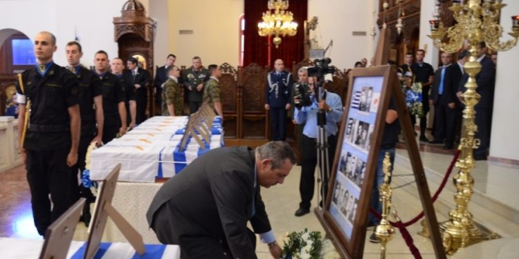 Ο Υπουργός Εθνικής Άμυνας Πάνος Καμμένος συνοδευόμενος από τον Αρχηγό ΓΕΕΘΑ Ναύαρχο Ευάγγελο Αποστολάκη ΠΝ και τον Αρχηγό ΓΕΣ Αντιστράτηγο Αλκιβιάδη Στεφανή, παρέστη στην τελετή παραλαβής των λειψάνων 17 Ελλήνων στρατιωτικών, πεσόντων και αγνοουμένων στη Μεγαλόνησο που πραγματοποιήθηκε στη Λευκωσία. Στον χαιρετισμό που απηύθυνε, ο ΥΕΘΑ είπε τα εξής:
