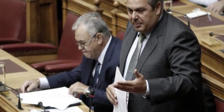 Για τη συνεργασία του με τον Αλέξη Τσίπρα και τον ΣΥΡΙΖΑ τονίζει ότι είναι μια έντιμη συμφωνία και δηλώνει ότι ο Αλέξης Τσίπρας είναι «έντιμος άνθρωπος που δεν χρωστάει σε κανέναν, δεν έχει αρπάξει από κανέναν και τραβάει τη χώρα πλέον έξω από τον βούρκο της μεταπολίτευσης». Τέλος, για τον Κυριάκο Μητσοτάκη υποστηρίζει ότι «έχει μετατρέψει τη ΝΔ σε πολιτικό βραχίονα μιας συμμορίας» και εκτιμά ότι «η ΝΔ μετά το πέρας της αξιολόγησης και την έξοδο της Ελλάδας από τα μνημόνια θα γίνει δεύτερο ΠΑΣΟΚ».