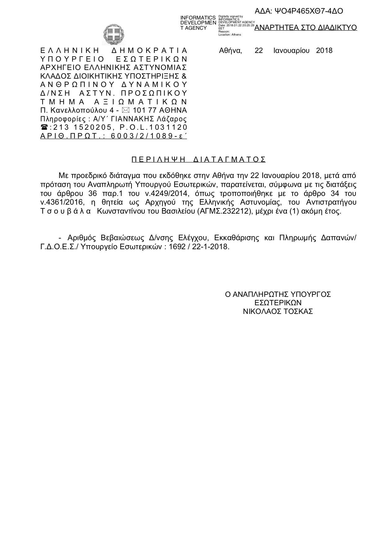 Κρίσεις αστυνομία 2018: Στη Διαύγεια τα Προεδρικά Διατάγματα με τις προαγωγές