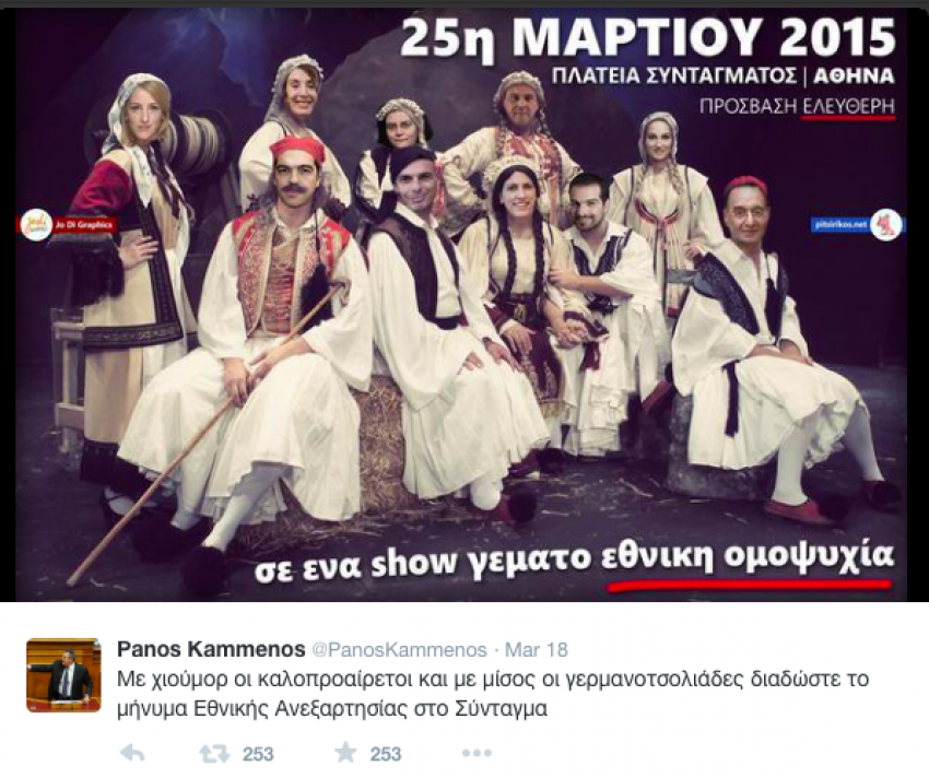 Ο Καμμένος πάντως αντιμετωπίζει και με χιούμορ την κριτική . Η φωτογραφία που ανέβασε στο twitter είναι η απόδειξη. Συνοδευόμενη βέβαια από αναφορά σε “γερμανοτσολιάδες”.