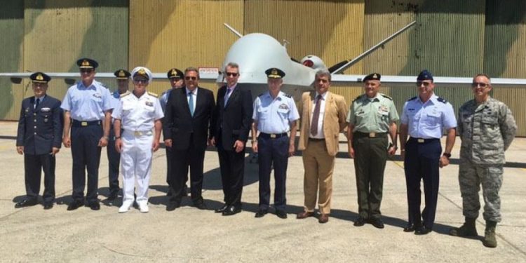 Στο υπόστεγο με τα Ελληνικά Drone Πήγασος 2 στην 110 ΠΜ, συνατήθηκαν ο ΥΕΘΑ Πάνος Καμμένος και ο Αμερικανός πρέσβης στην Αθήνα Τζέφρι Πάϊατ.