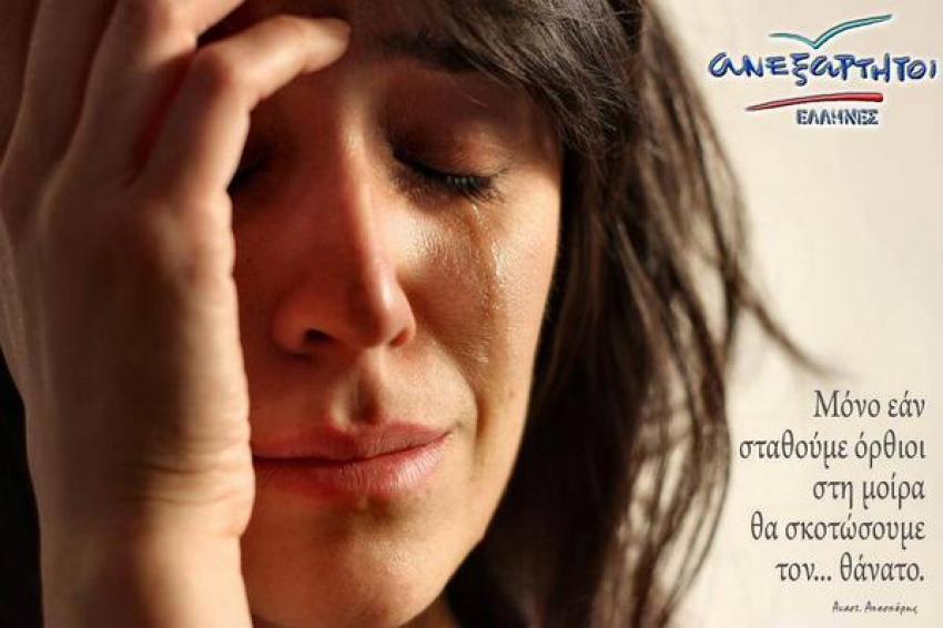 Με μια φωτογραφία επέλεξε να τοποθετηθεί ,για πρώτη φορά μετά από την ανακοίνωση της συμφωνίας στις Βρυξέλλες ο ΥΕΘΑ Πάνος Καμμένος. Το δακρυσμένο πρόσωπο μιας γυναίκας είναι η φωτογραφία. Και η “λεζάντα” της; “Μόνο αν σταθούμε όρθιοι στη μοίρα θα …σκοτώσουμε τον θάνατο”.