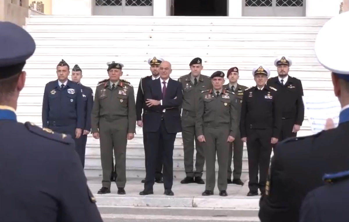 Στο βίντεο που επισυνάπτει ο ΥΕΘΑ Νίκος Δένδιας απεικονίζεται σύσσωμη η στρατιωτική ηγεσία των Ενόπλων Δυνάμεων: ο Αρχηγός ΓΕΕΘΑ Στρατηγός Κωνσταντίνος Φλώρος. ο Αρχηγός ΓΕΑ Αντιπτέραρχο (Ι) Θεμιστοκλής Μπουρολιάς, ο Αρχηγός ΓΕΣ Αντιστράτηγος Άγγελος Χουδελούδης και ο Αρχηγός ΓΕΝ Αντιναύαρχος Ιωάννη Δρυμούση ΠΝ, μπροστά από το Υπουργείο Εθνικής Άμυνας.