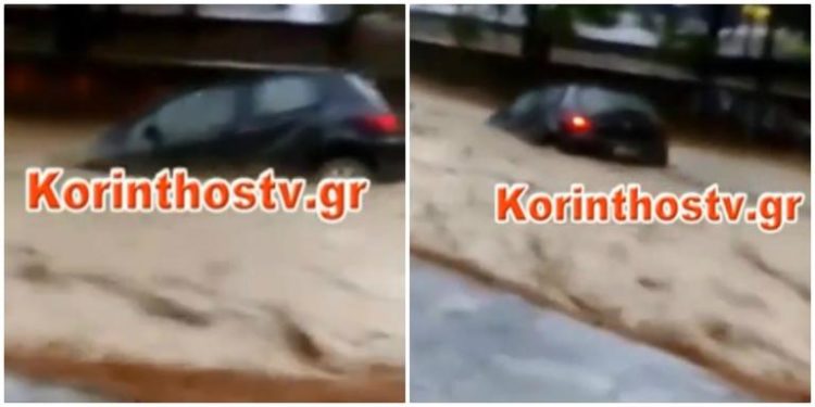 Λίγο μετά… σοκ. Ένα αυτοκίνητο φαίνεται να παρασύρεται από τον χείμαρρο λες και είναι… παιχνίδι!