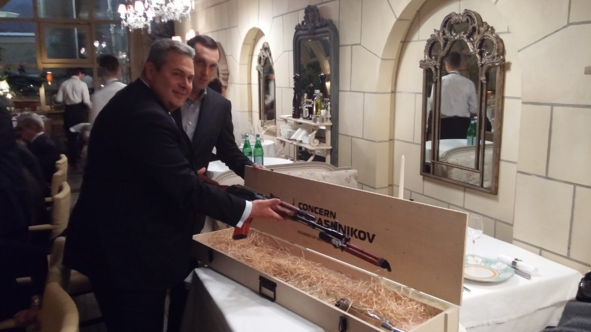 Ο Πάνος Καμμένος πήρε το Καλάσνικοφ. Η φωτογραφία είναι από την επίσκεψή του στην Ρωσία. Ο φωτογραφικός φακός -μάλλον κινητού- τον “έπιασε” την ώρα που που περιεργάζεται ένα Καλάσνικοφ κυριολεκτικά του “κουτιού”.