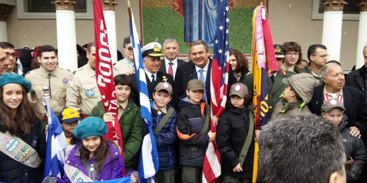 Κλείνοντας, ο υπουργός Εθνικής ‘Αμυνας, που εκπροσωπεί την κυβέρνηση στους εορτασμούς της Ομογένειας στη Νέα Υόρκη για την επέτειο της 25ης Μαρτίου, με αποκορύφωμα την σημερινή παρέλαση στην 5η λεωφόρο του Μανχάταν και ο οποίος συνοδεύεται από τον αρχηγό ΓΕΕΘΑ στρατηγό Μιχαήλ Κωσταράκο και τον αρχηγό ΓΕΝ αντιναύαρχο Ευάγγελο Αποστολάκη, τόνισε ότι «οι Ένοπλες Δυνάμεις αντιμετωπίζουν τις απειλές απ’ όπου κι αν προέρχονται. Εμείς, έτσι όρθιοι θα είμαστε (δείχνοντας τους τσολιάδες της Προεδρικής Φρουράς), δεν θα γονατίσουμε και θα υπηρετήσουμε τα ιδανικά του 1821. Τα ιερά και τα όσια δεν τα διαπραγματευόμαστε με κανένα. Από την 5η λεωφόρο του Μανχάταν θα στείλουμε ένα μήνυμα ανεξαρτησίας σε όλο τον κόσμο».