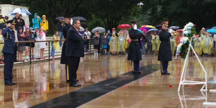 Υπό καταρρακτώδη βροχή ο ΥΕΘΑ Πάνος Καμμένος στο πλαίσιο της επίσημης επίσκεψής του στην Ουάσιγκτον, κατέθεσε στεφάνι στο Μνημείο του Αγνώστου Στρατιώτη στο Εθνικό Κοιμητήριο του Άρλιγκτον.
