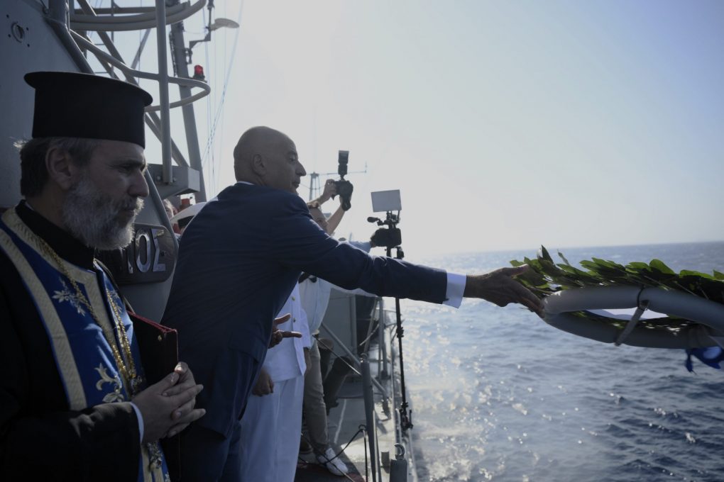Ο κ. Δένδιας, συνοδευόμενος από τον Αρχηγό ΓΕΝ Αντιναύαρχο Δημήτριο – Ελευθέριο Κατάρα ΠΝ, επιβιβάστηκε στην ΤΠΚ «ΜΥΚΟΝΙΟΣ» του Πολεμικού Ναυτικού, που έπλευσε στη θαλάσσια περιοχή βύθισης του Κ/Δ «ΕΛΛΗ». Ακολούθησε η επιμνημόσυνη δέηση για τους πεσόντες και η ρίψη στεφάνων από τον Υπουργό Εθνικής Άμυνας και τον Αρχηγό ΓΕΝ. Στο σημείο που έπλευσε η ΤΠΚ «ΜΥΚΟΝΙΟΣ» ναυλοχεί τιμητικά το Α/Γ «ΣΑΜΟΣ».