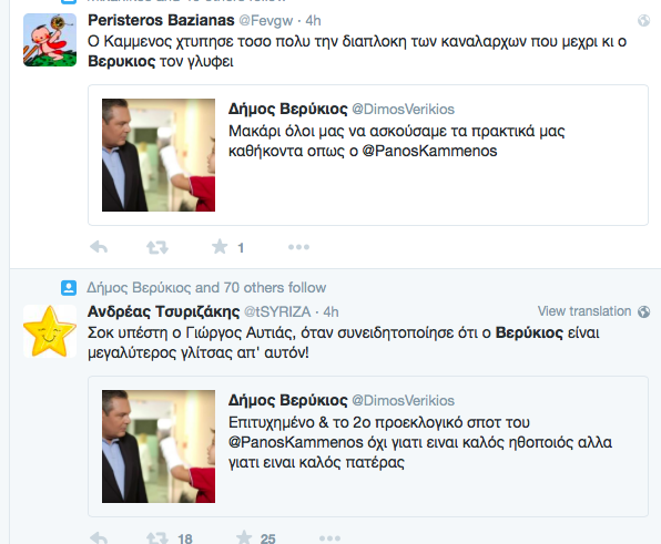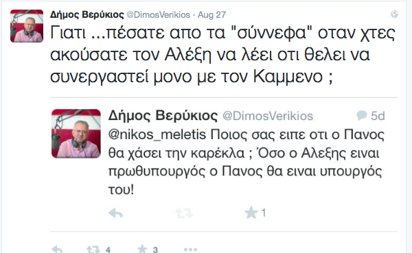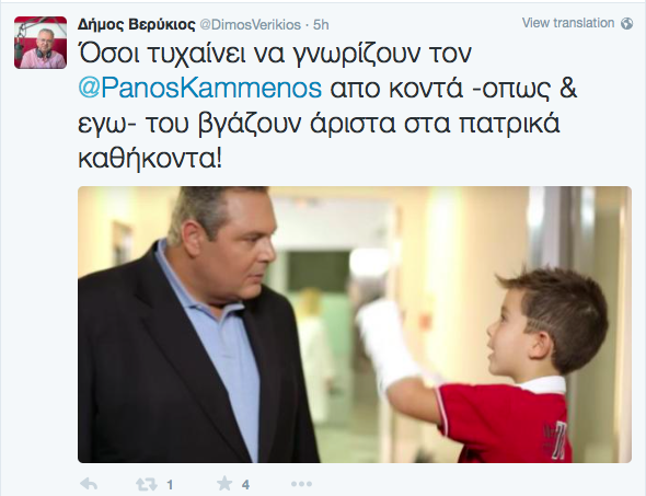 Ο δημοσιογράφος Δήμος Βερύκιος στηρίζει με …1000 τον πρώην ΥΕΘΑ. Ενδεικτικά είναι τα μηνύματά του στο twitter. Όπου με αφορμή το τελευταίο σποτ των ΑΝΕΛ με τον πιτσιρικά Αλέξη να έχει σπάσει το χέρι του, του έδωσε την ευκαιρία να επισημάνει και να αναδείξει την “πατρική” φυσιογνωμία του Πάνου Καμμένου!