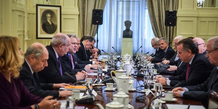 Στη σημερινή προγραμματισμένη συνεδρίαση, υπό τον αναπληρωτή υπουργό Εξωτερικών, Γιώργο Κατρούγκαλο, συμμετείχαν εκ μέρους του ΣΥΡΙΖΑ ο πρόεδρος της Διαρκούς Επιτροπής Εθνικής ‘Αμυνας και Εξωτερικής Πολιτικής της Βουλής, Κώστας Δουζίνας, η βουλευτής Μαρία Τριανταφύλλου και ο συντονιστής του Τομέα Διεθνών Σχέσεων του κόμματος, Παναγιώτης Τριγάζης, εκ μέρους της ΝΔ ο τομεάρχης Εξωτερικών, Γιώργος Κουμουτσάκος και ο πρέσβης επί τιμή, Γιάννης Σαββαΐδης, εκ μέρους της Δημοκρατικής Συμπαράταξης ο Ανδρέας Λοβέρδος, εκ μέρους του Ποταμιού ο βουλευτής Σπύρος Δανέλλης και ο πρέσβης επί τιμή, Γιώργος Κακλίκης, εκ μέρους των Ανεξάρτητων Ελλήνων ο βουλευτής Κώστας Κατσίκης και ο πρέσβης εκ προσωπικοτήτων, Ελευθέριος Καραγιάννης, και εκ μέρους της Ένωσης Κεντρώων οι Μάριος Γεωργιάδης και Γιώργος Κουτουλάκης.