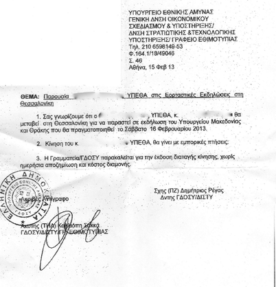 Σύμφωνα με το έγγραφο που έφθασε στα χέρια μας υψηλόβαθμος αξιωματούχος -όχι ο υπουργός- του Υπουργείου Εθνικής Άμυνας μετέβη στην Θεσσαλονίκη για τις εορταστικές εκδηλώσεις που έλαβαν χώρα στην πόλη το Σάββατο 16 Φεβρουαρίου 2013. Με την μόνη διαφορά ότι γιορτή δεν υπήρχε. Υπάρχουν ίσως άλλοι δεσμοί με την Θεσσαλονίκη.