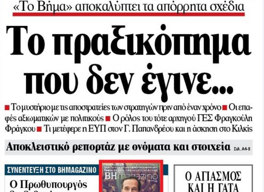 Το ΒΗΜΑ της Κυριακής που κυκλοφορεί σε λίγες ώρες έχει πρώτο θέμα το πως “αποφύγαμε το πραξικόπημα”! Το ρεπορτάζ συνοδεύεται και από άρθρο του Στ.Ψυχάρη, ενώ η εφημερίδα ισχυρίζεται ότι έχει στοιχεία και ονόματα.