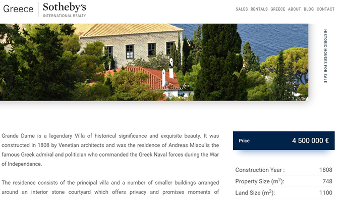 Το σπίτι του ναύαρχου πωλείται μέσω του οίκου δημοπρασιών Sotheby’s και ο δήμαρχος Ύδρας έστειλε ήδη επιστολή στην υπουργό Πολιτισμού.