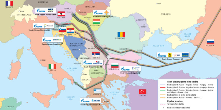 Ο αγωγός South Stream αναμενέται να λειτουργήσει το 2015 και θα μεταφέρει εως και 63 δισ. κυβικά μέτρα φυσικού αερίου ετησίως από τη Ρωσία – κάτω από τη Μαύρη Θάλασσα – στη Βουλγαρία, τη Σερβία, την Ουγγαρία, τη Σλοβενία, την Αυστρία και την Ιταλία.