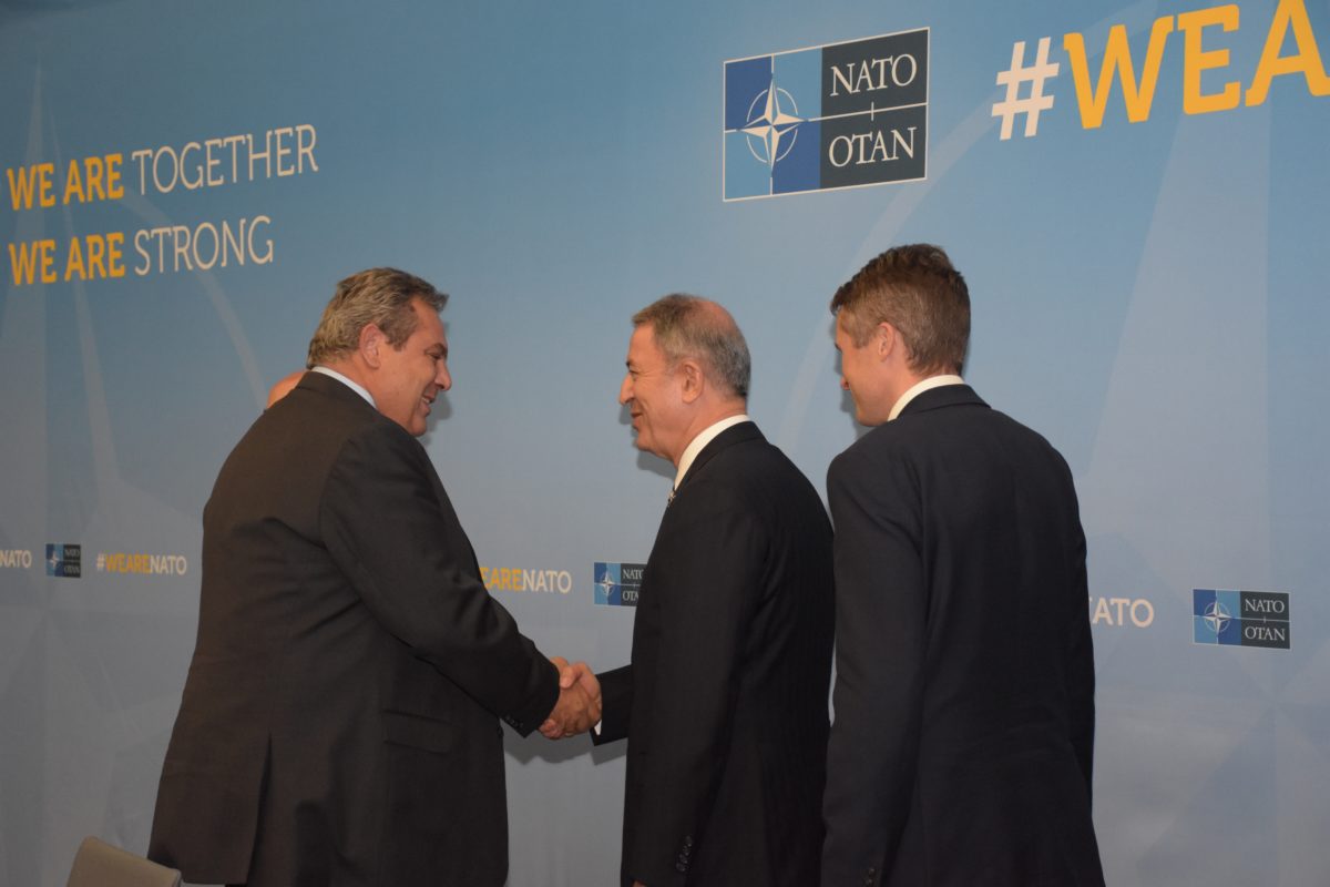 Οι υπουργοί Εθνικής Άμυνας Ελλάδας και Τουρκίας είχαν ένα σύντομο τετ-α-τετ λίγο πριν από την έναρξη της Συνόδου, και στο φωτογραφικό στιγμιότυπο είναι εμφανές το καλό κλίμα που είχε διαμορφωθεί μετά τα παραπάνω γεγονότα.