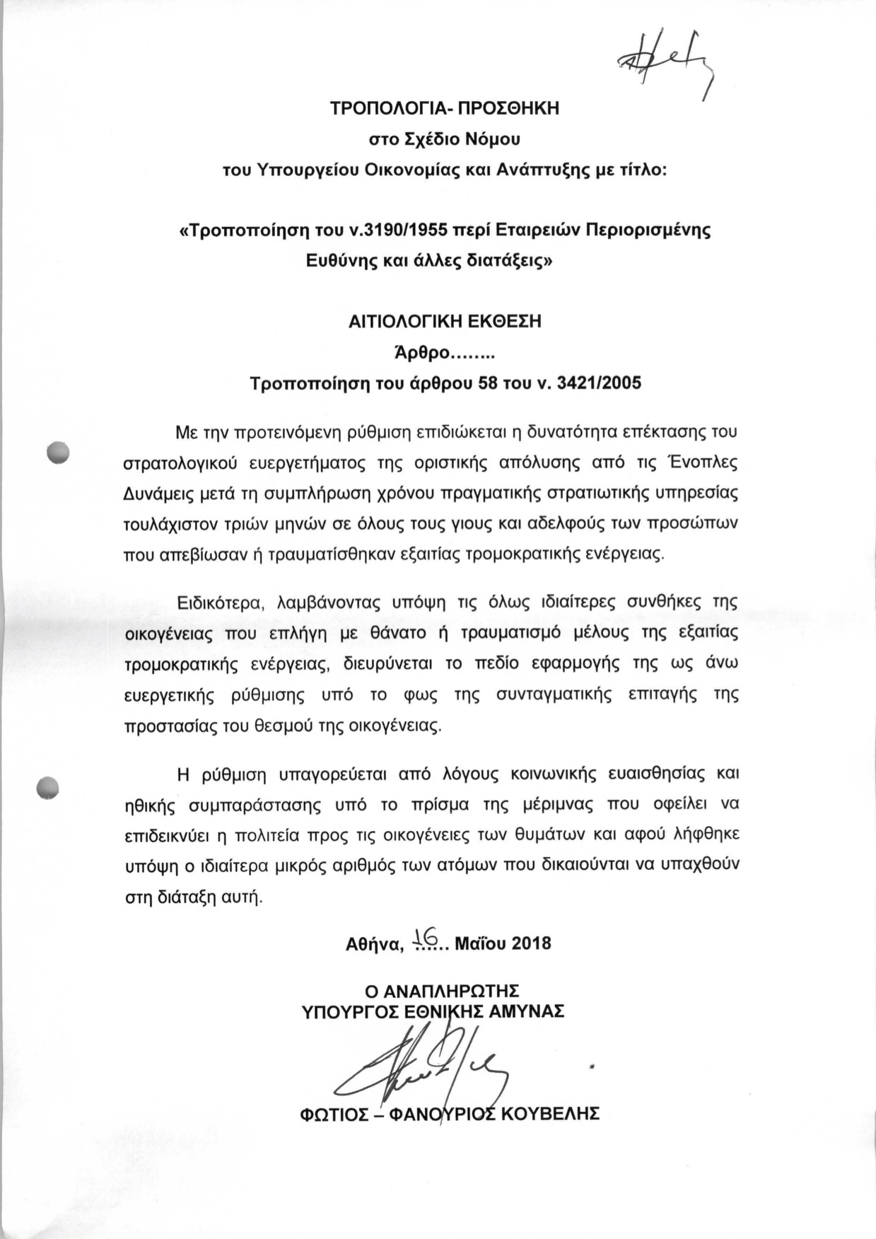 Στην αιτιολογική έκθεση αναφέρεται ότι: Ειδικότερα, όπως υποστηρίζει ο αναπληρωτής υπουργός ΕθνικήςΆμυνας Φώτης Κουβέλης στην αιτιολογική έκθεση, λαμβάνοντας υπόψη τις όλως ιδιαίτερες συνθήκες της οικογένειας που επλήγη με θάνατο ή τραυματισμό μέλους της εξαιτίας τρομοκρατικής ενέργειας, διευρύνεται το πεδίο εφαρμογής της ως άνω ευεργετικής ρύθμισης υπό το φως της συνταγματικής επιταγής της προστασίας του θεσμού της οικογένειας.