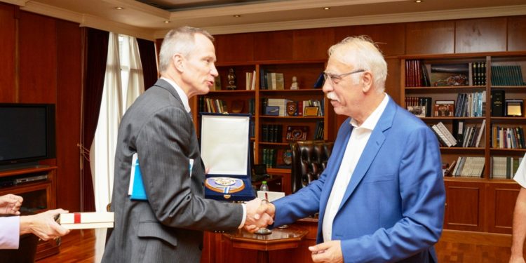 Ο Αναπληρωτής Υπουργός Εθνικής Άμυνας, Δημήτρης Βίτσας, συναντήθηκε σήμερα Πέμπτη 27 Ιουλίου, στο γραφείο του, με τον Αναπληρωτή Βοηθό Υπουργό Άμυνας των ΗΠΑ, Thomas W. Goffus, αρμόδιο για θέματα Ευρώπης και ΝΑΤΟ.