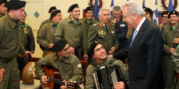 Οι χορωδίες του Κέντρου Εκπαιδεύσεως Τεθωρακισμένων, του Ομίλου Σιδηροδρομικών, του Συλλόγου Καστελοριζίων και του Σώματος Ελλήνων Προσκόπων, είπαν τα κάλαντα στον Υπουργό Εθνικής Άμυνας Δημήτρη Αβραμόπουλο.