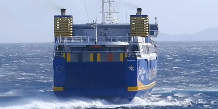 Το Superrunner προσεγγίζει το λιμάνι της Τήνου, προερχόμενο από τη Μύκονο. Στην περιοχή πνέουν ισχυροί βόρειοι άνεμοι που οι ριπές τους φτάνουν τα 8 μποφόρ.