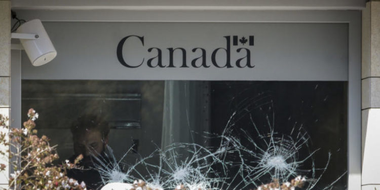Η επίθεση στην πρεσβεία του Καναδά έγινε στις 6.10 π.μ. Οι κουκουλοφόροι έσπασαν την τζαμαρία με βαριοπούλες, πέταξαν μαύρες μπογιές και εξαφανίστηκαν. Σύμφωνα με πληροφορίες, προσήχθη ένας άνδρας, ο οποίος στη συνέχεια αφέθηκε ελεύθερος. Να σημειωθεί ότι το κτήριο φυλάσσεται από ιδιωτική εταιρεία security.