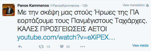 Ο ΥΕΘΑ Πάνος Καμμένος δεν έλειψε από καμία εκδήλωση για την εορτή της ΠΑ αυτές τις ημέρες. Εκτός απ΄ αυτό όμως με ένα μήνυμά του στο twitter που παραπέμπει σε ένα βίντεο για την ΠΑ, εύχεται στους “Αετούς” της ΠΑ καλές προσγειώσεις.