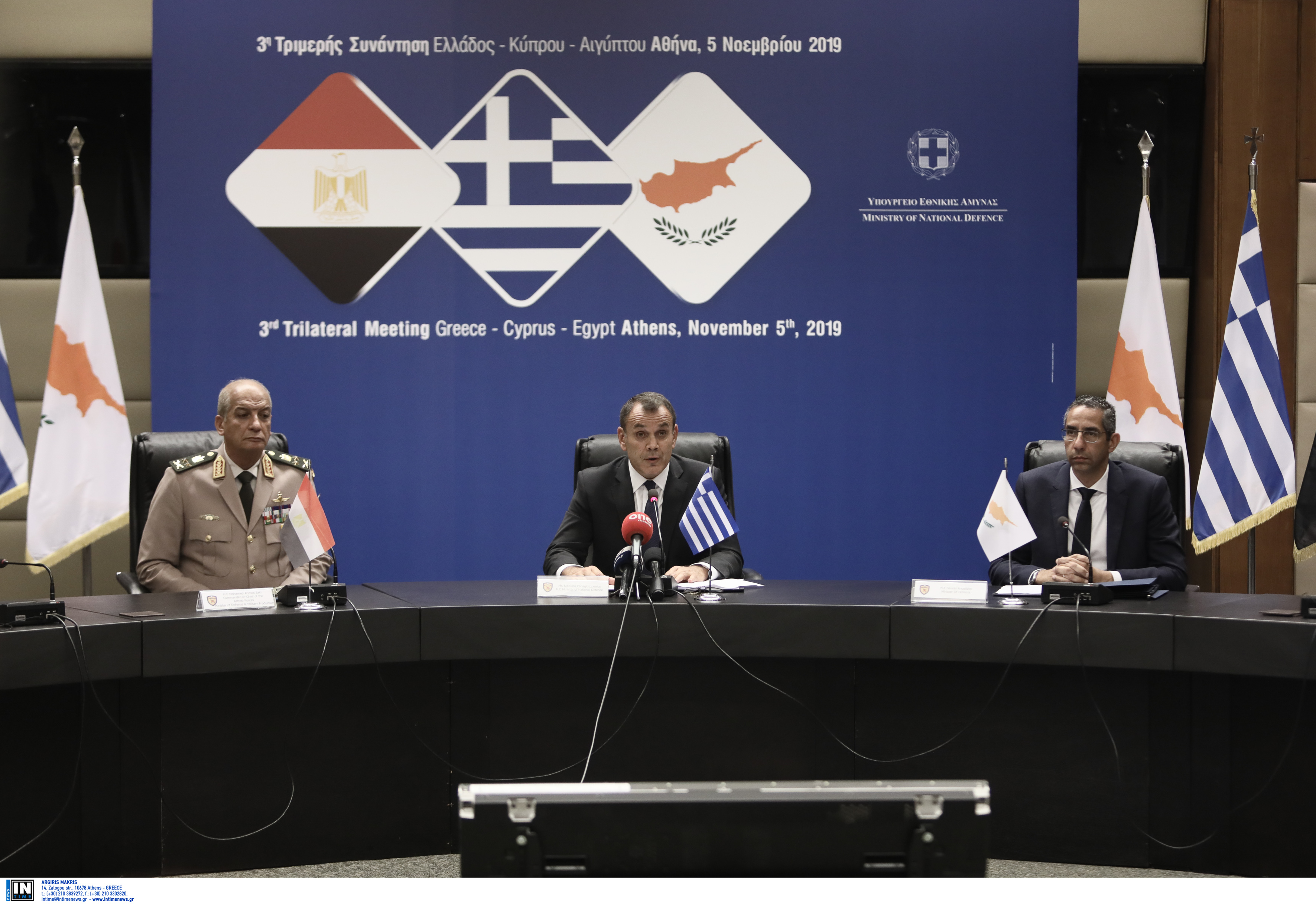 Σε ομόφωνη καταδίκη των παράνομων και προκλητικών ενεργειών της Τουρκίας στη νοτιανατολική Μεσόγειο και το Αιγαίο προχώρησαν οι υπουργοί Άμυνας της Ελλάδας , της Κύπρου κατά την ολοκλήρωση των εργασιών 3ης Τριμερούς Συναντήσεως Ελλάδος – Κύπρου – Αιγύπτου που πραγματοποιήθηκε στην Αθήνα.