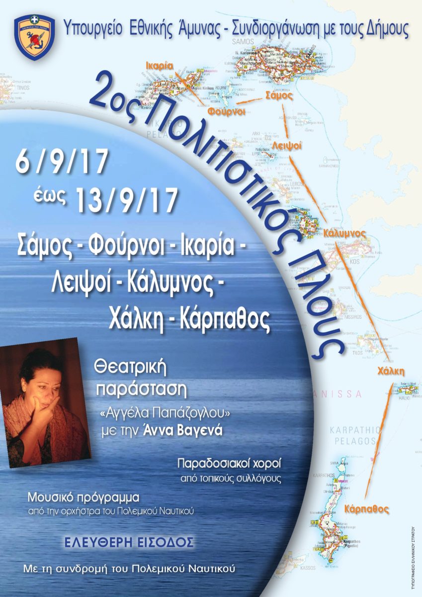Το Υπουργείο Εθνικής Άμυνας, με πρωτοβουλία του Αναπληρωτή Υπουργού Δημήτρη Βίτσα και με τη συνδρομή του Πολεμικού Ναυτικού, διοργανώνει τον 2ο Πολιτιστικό Πλου με πολεμικό πλοίο σε νησιά του Ανατολικού Αιγαίου, το διάστημα Τετάρτη 6 Σεπτεμβρίου έως Τετάρτη 13 Σεπτεμβρίου 2017.