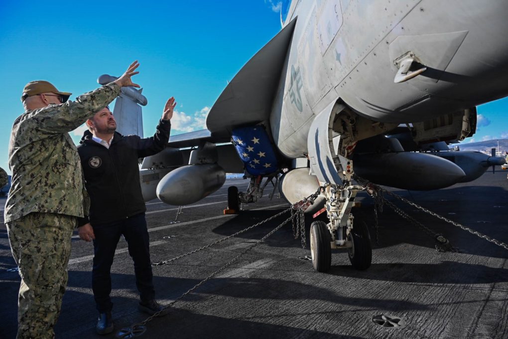 Τον Υφυπουργό Εθνικής Άμυνας υποδέχθηκαν ο Διοικητής της Δύναμης Κρούσης 10 (Commander Carrier Strike Group 10) Υποναύαρχος Dennis Velez και ο Κυβερνήτης του USS George H.W. Bush Πλοίαρχος David-Tavis Pollard, οι οποίοι τον ενημέρωσαν τόσο για τις επιχειρησιακές δυνατότητες του αεροπλανοφόρου όσο και για το εύρος των αποστολών που μπορεί να αναλάβει.