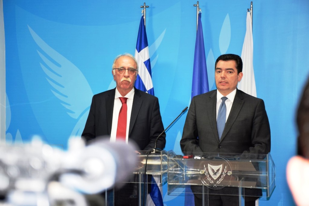 Δημήτρης Βίτσας: Πρώτα να ευχαριστήσω τον Υπουργό και για τη θερμή υποδοχή και για την ενημέρωση και την ανταλλαγή απόψεων, η οποία νομίζω προχώρησε τα πράγματα και σε αρκετό βάθος. Συγχρόνως να ευχηθώ σε όλους και σε όλες, χρόνια πολλά και το 2016 να κάνουμε ένα βήμα μπροστά και για την Κύπρο και για την Ελλάδα. Η θέση της Ελλάδας, γενικά, όσο αφορά το ζήτημα, το ούτως καλούμενο Κυπριακό, είναι γνωστή. Άλλωστε πρόσφατες είναι και οι επισκέψεις του Υπουργού Εξωτερικών, του Νίκου Κοτζιά, του Προέδρου της Βουλής, του Νίκου Βούτση και του Πρωθυπουργού, του Αλέξη Τσίπρα και βεβαίως του Προέδρου της Δημοκρατίας, του κυρίου Προκόπη Παυλόπουλου. Είναι γνωστό ότι είναι αταλάντευτος και κοινός μας στόχος με την Κυπριακή Δημοκρατία, ο τερματισμός της τουρκικής κατοχής και η εξεύρεση μιας συνολικά, εθνικά αποδεκτής και βιώσιμης λύσης, στη βάση των αποφάσεων των Ηνωμένων Εθνών και της ιδιότητας της Κυπριακής Δημοκρατίας ως κράτους μέλους της Ευρωπαϊκής Ένωσης. Η Ελλάδα διαχρονικά στηρίζει σταθερά τις διακοινοτικές συνομιλίες , οι οποίες παρά τις απογοητεύσεις του παρελθόντος και τις δυσκολίες που ακόμα συνεχίζονται, αποτελούν ίσως την μόνη αποδεκτή, από τα ενδιαφερόμενα μέρη, μέθοδο εξεύρεσης συμφωνημένης λύσης για το πρόβλημα. Βεβαίως, η Αθήνα δεν έχει κανένα λόγο να παρέμβει σε αυτή τη διαπραγμάτευση αλλά στηρίζει σαφώς τις προσπάθειες της κυπριακής κυβέρνησης και της Κυπριακής Δημοκρατίας. Έχουμε καταστήσει σαφές, προς κάθε κατεύθυνση, ότι πραγματική και βιώσιμη λύση του Κυπριακού προβλήματος, δεν νοείται χωρίς την απόσυρση όλων των κατοχικών στρατευμάτων και χωρίς την κατάργηση του αναχρονιστικού συστήματος εγγυήσεων του 1960. Περιμένουμε από την Άγκυρα εποικοδομητική στάση, με συγκεκριμένες ενέργειες, που θα συμβάλουν έμπρακτα και αποτελεσματικά στη διαπραγματευτική προσπάθεια των δύο κοινοτήτων, για την εξεύρεση μιας αμοιβαία αποδεκτής λύσης στο Κυπριακό. Όπως είπα και στον Υπουργό, καλύτερα να εργαζόμαστε για τη λύση, παρά να μιλάμε για τη λύση, και όταν θα έρθει η λύση θα είναι και μια επιτυχημένη λύση προς το συμφέρον του κυπριακού λαού. Είχαμε την ευκαιρία ακόμα με τον Υπουργό να συζητήσουμε και ζητήματα εμβάθυνσης της συνεργασίας μας, σε ζητήματα που αφορούν την άμυνα και την αμυντική βιομηχανία και πάνω σε αυτά τα ζητήματα έχουμε πεδίον δόξης λαμπρόν και πολλά πράγματα να κάνουμε πάνω στα πολλά που ήδη έχουμε κάνει. Με αυτό τον τρόπο η Ελλάδα και η Κύπρος, η Κύπρος και η Ελλάδα, μπορεί να είναι ο παράγοντας σταθεροποίησης της περιοχής, ο παράγοντας διαμόρφωσης ειρηνικών διαδικασιών επίλυσης των προβλημάτων, ώστε να βοηθηθούν όλες οι κοινωνίες και όλοι οι λαοί για ένα καλύτερο μέλλον.