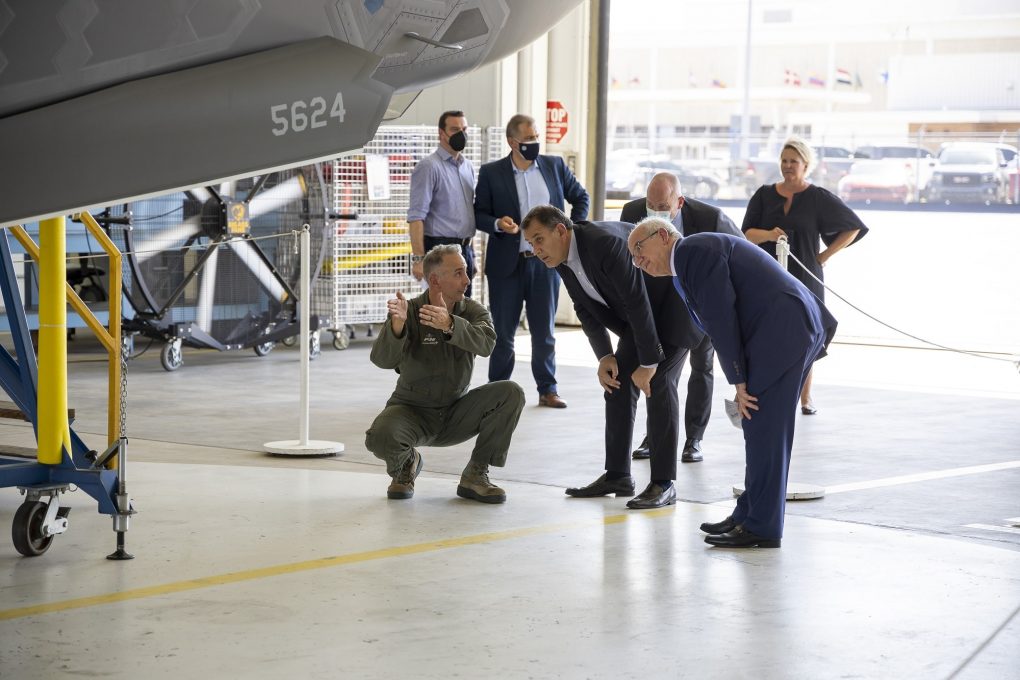 Επίσης, ο ΥΕΘΑ βρέθηκε στα στέγαστρα όπου δοκιμάζονται τα νέα μαχητικά κι έλαβε πλήρη ενημέρωση από τον πιλότο δοκιμών Κρις Σπινέλλι για τα τεχνικά και επιχειρησιακά χαρακτηριστικά των αεροσκαφών.