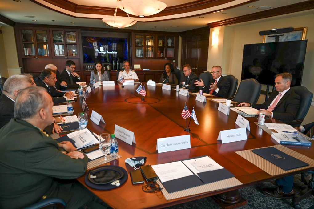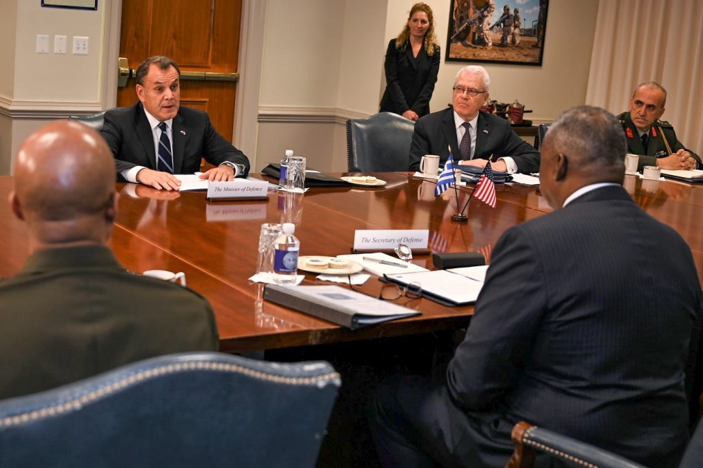 «Κύριε Υπουργέ, αγαπητέ Λόιντ, είναι ιδιαίτερη η χαρά μου να σε συναντώ σήμερα εδώ στην Ουάσιγκτον. Αποτελεί πραγματική τιμή να επισκέπτομαι το Πεντάγωνο. Οπότε επίτρεψέ μου κατ’ αρχάς να τονίσω με τη σειρά μου τη σημασία μιας ισχυρής, σε βάθος και διαρκώς διευρυνόμενης στρατηγικής αμυντικής συνεργασίας μεταξύ των Ηνωμένων Πολιτειών και της Ελλάδας, μιας συνεργασίας που έχει φτάσει στο υψηλότερο σημείο της ιστορίας της τα τελευταία χρόνια μετά τις δύο επικαιροποιήσεις της συμφωνίας αμοιβαίας αμυντικής συνεργασίας το 2019 και πέρυσι.