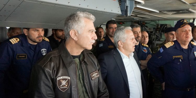 Τον Υπουργό Εθνικής Άμυνας συνόδευσαν ο Αρχηγός ΓΕΕΘΑ, Πτέραρχος Χρήστος Χριστοδούλου και ο Αρχηγός ΓΕΝ, Αντιναύαρχος Νικόλαος Τσούνης ΠΝ.