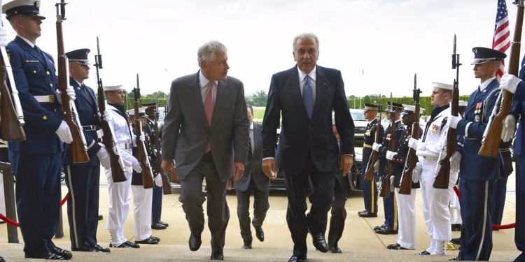 “Ο Υπουργός Άμυνας Chuck Hagel καλοσώρισε τον Έλληνα Υπουργού Άμυνας Δημήτρη Αβραμόπουλου στο Πεντάγωνο.