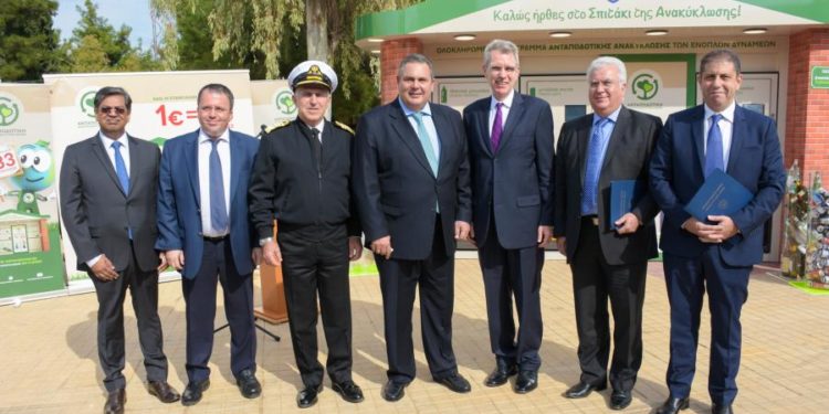 Ο Υπουργός Άμυνας Πάνος Καμμένος παρευρέθηκε στην εκδήλωση για τα εγκαίνια του πιλοτικού προγράμματος ανταποδοτικής ανακύκλωσης στο Στρατόπεδο «ΠΑΠΑΓΟΥ».
