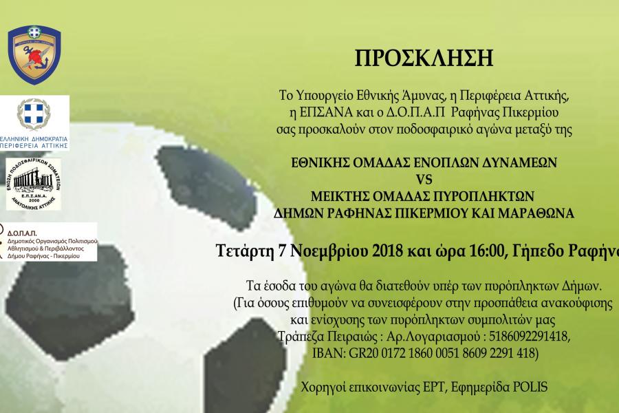 Το Υπουργείο Εθνικής Άμυνας, η Περιφέρεια Αττικής, ο Δήμος Ραφήνας και η ΕΠΣ Ανατολικής Αττικής διοργανώνουν αγώνα ποδοσφαίρου μεταξύ της Εθνικής ομάδας Ενόπλων Δυνάμεων και Σωμάτων Ασφαλείας και της μικτής ομάδας Επιλέκτων Ανατολικής Αττικής, για την οικονομική ενίσχυση των πυρόπληκτων.